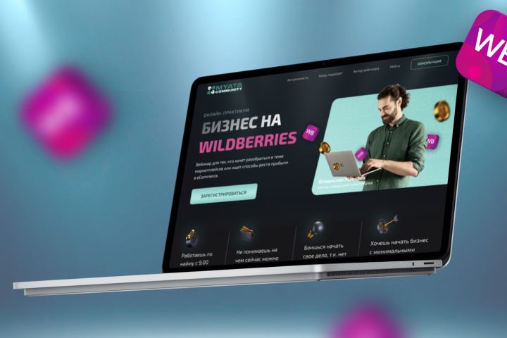 Одностраничный сайт для компании Myata. Цель — познакомить пользователя с проводимым мероприятием — вебинар «Бизнес на Wildberries», дать возможность записаться на него. Ссылка на сайт — https://myatawb.ru