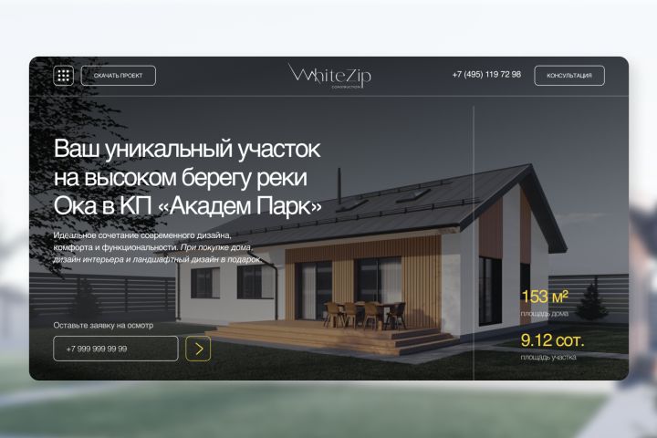 Одностраничный сайт для строительной компании WhiteZip с целью рекламы и продажи строящегося дома. https://whitezip-dom.ru