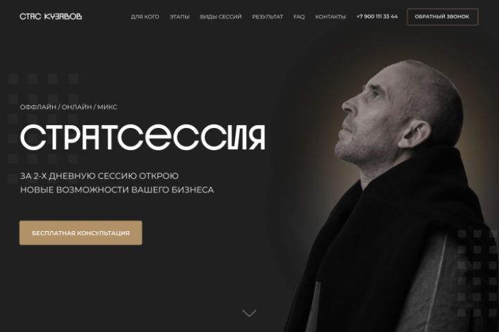 Лендинг для психолога Стаса Кузавова с целью познакомить клиента с понятием Стратегической сессии, для чего она нужна и в чем преимущества. Сайт сделан на платформе Тильда. Ссылка на сайт — https://kuzavov-strategy.com/