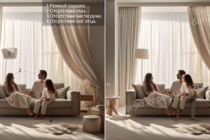 По требованию заказчика были дорисованы глаза, конечности , задний план и поправлена цветокоррекция/яркость фото которое создал искусственный интеллект.