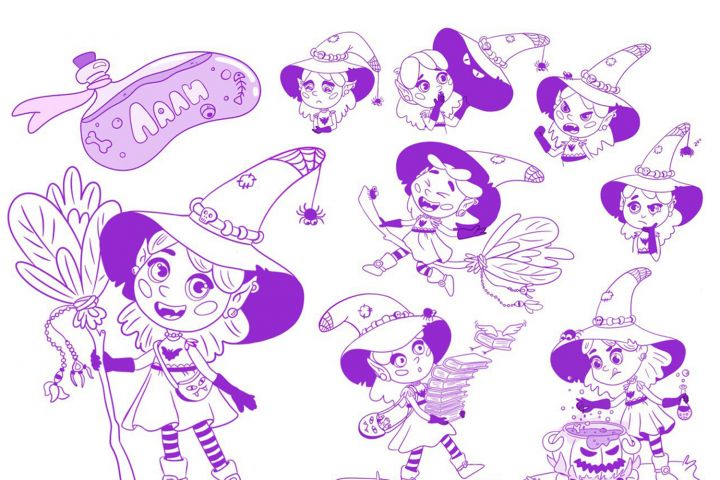 Разработка дизайна персонажа. Проработка его цвета. Отрисовка в различных позах и эмоциях (эмоции не в полный рост).