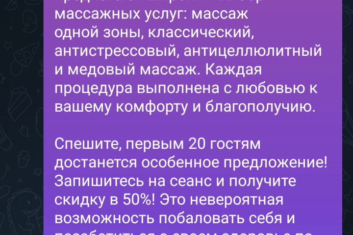 Рекламный текст, до 500 символов, для массажного салона, конкретизируется реклама для новых клиентов