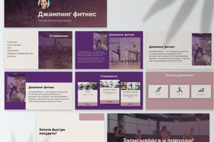 Презентация для фитнес-школы, которая ведет занятия на батутах – современное и набирающее обороты направление фитнеса. Формат: pptx