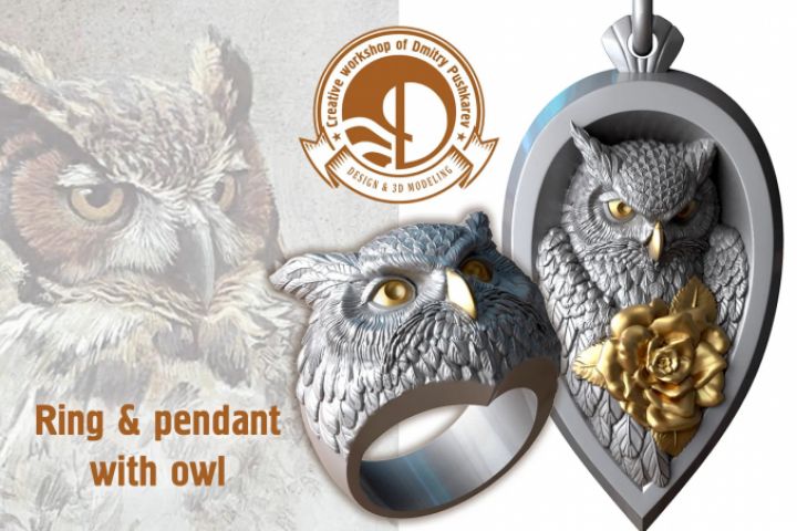 3d модели кольца и подвески с совой в *.stl, *.obj. Моими задачами были разработка дизайна и выполнение моделирования