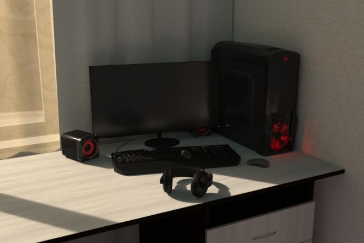 Компьютерный стол с компьютером, монитором, мышкой, клавиатурой, колонками в комнате рядом с окном.