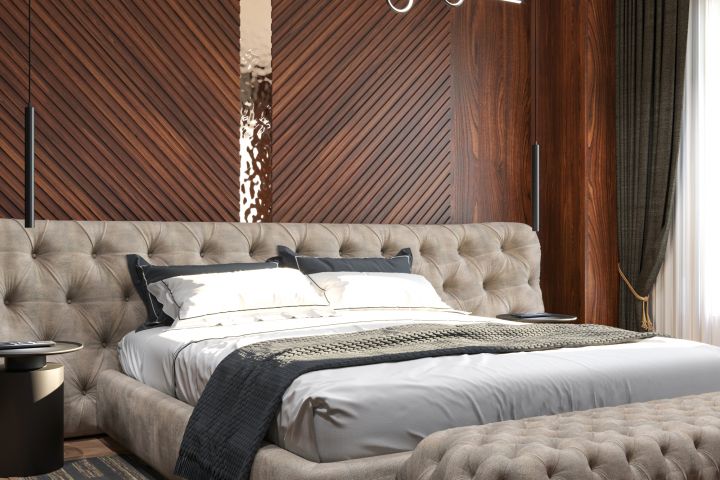 Клиент хотел акцентировать внимание на зону изголовья, также, чтобы все было выполнено в современном стиле.