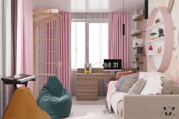 Данная детская спальная комната разрабатывалась для девочки, тут были учтены такие нюансы, чтобы я(дизайнер) уместила основные зоны: зона сна(отдыха), зона обучения и небольшая игровая зона.