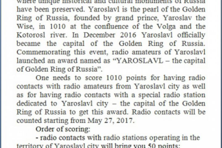 Перевод описания условий конкурса для радиолюбителей, приуроченного к юбилею основания города Ярославль