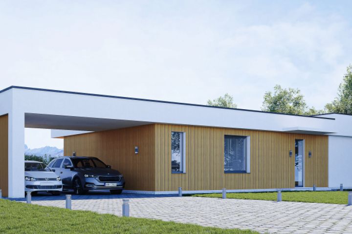 Одноэтажный дом на юге. Бетон, деревянные рейки, большие окна, ландшафт