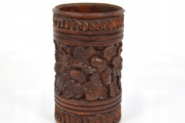 Деревянная карандашница, высота 12 см, диаметр 6 см. Вмещает около 30 ручек и карандашей. Украшена выполненным вручную рельефным узором в виде дубовых листьев и желудей.