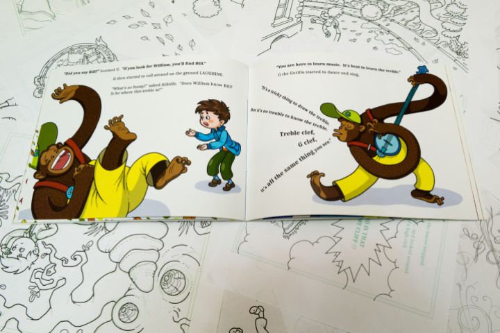 Разворот второй книги из серии книг, посвященной обучению детей музыкальной грамоте. Книга издана в Канаде в 2017 году.