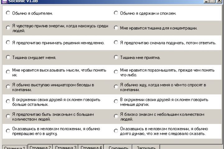 Стандартный интерфейс программы, реализующей опросник для определения соционического типа испытуемого.