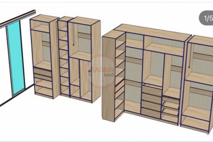 сложная гардеробная, разбитая на отдельные 6 модулей. Есть как пантографы, так и выдвижные ящики с ячейками из ДСП 10 мм. Особенностью является дверь-купе с зеркалом на монорельсах, задвигающаяся в потайную нишу между шкафами.