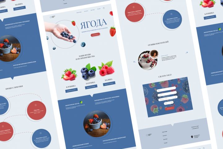 Дизайн лендинга / посадочной страницы для продажи ягод. Клиент хотел отразить в лендинге свежесть и чистоту продукции. Для этого использовали светлые оттенки цветов и яркие акценты в виде ягод.