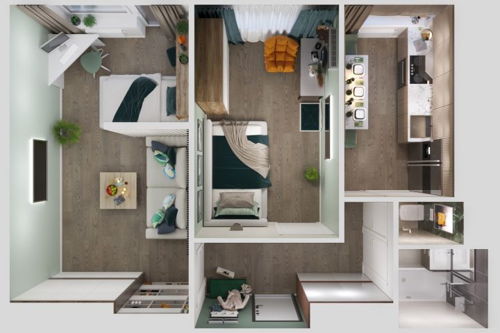 Дизайнерский проект интерьера квартиры площадью 45 квадратных метров, планировка, визуализация, рабочка