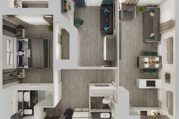Дизайнерский проект интерьера квартиры площадью 70 квадратных метров, планировочное решение, визуализация, рабочая часть проекта