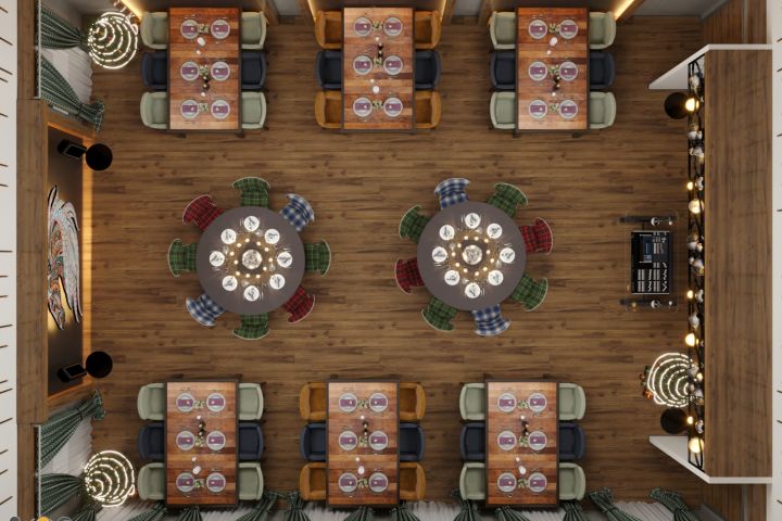 Дизайнерский проект интерьера банкетного зала ресторана - планировочное решение, визуализация, рабочая часть