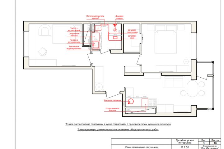 Технический дизайн проект квартиры площадью 52 квадратных метра включает в себя разработку планировочного решения с расстановкой мебели, сантехники и оборудования, планы монтажа стен, полов и потолков, схемы электрики, сантехники, отопления и вентиляции, раскладки покрытий, развертки и разрезы, ведомости и спецификации, а также расчет количества отделочных материалов. Подойдет для Вас, если Вам нужен ремонт без визуализации - т.е., если у Вас есть четкое представление стиля, цвета и композиции будущего интерьера.