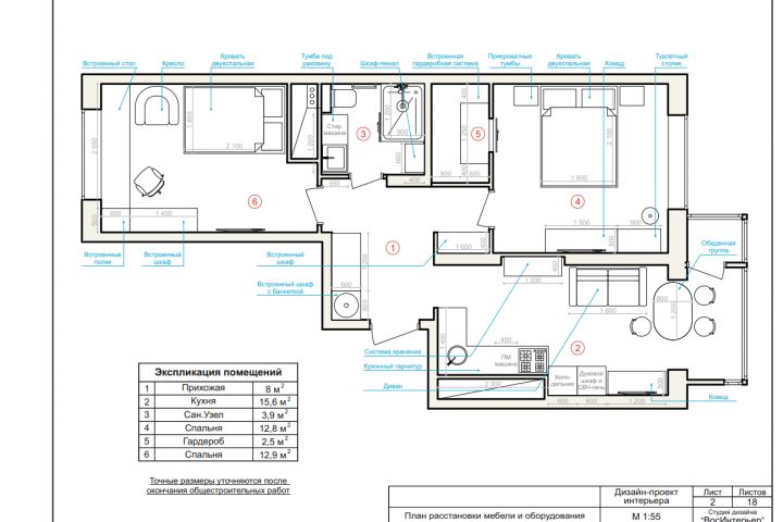 Технический дизайн проект квартиры площадью 52 квадратных метра включает в себя разработку планировочного решения с расстановкой мебели, сантехники и оборудования, планы монтажа стен, полов и потолков, схемы электрики, сантехники, отопления и вентиляции, раскладки покрытий, развертки и разрезы, ведомости и спецификации, а также расчет количества отделочных материалов. Подойдет для Вас, если Вам нужен ремонт без визуализации - т.е., если у Вас есть четкое представление стиля, цвета и композиции будущего интерьера.