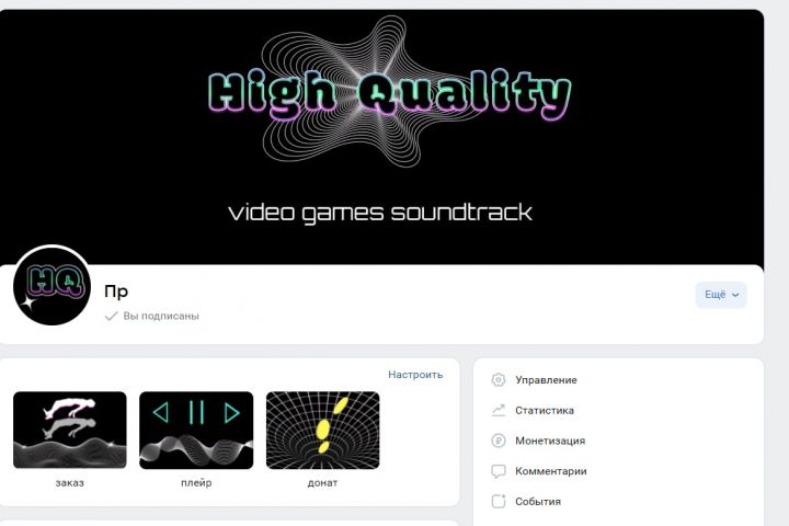Произведена аналитика ЦА. Аналитика конкурентов. Подобран фирменный стиль (обложка, ава, кнопки для доната, плейлиста и заказа треков из игр.