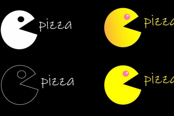Выполнен логотип для пиццерии "ПиццаПакмен". Варианты на черном фоне: 1. Белый 2. Белый контур 3. Градиент 4. Цвет без градиента
