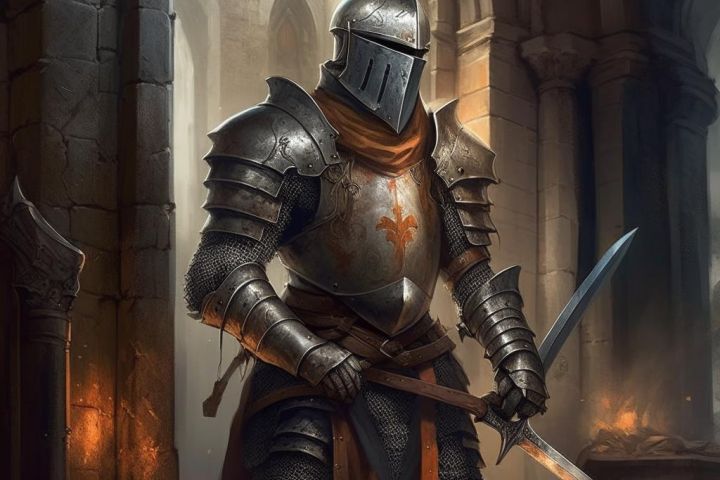 Персонаж для компьютерной игры про средневековых рыцарей, рыцари ведут осаду крепости, рыцари хотят сломать ворота замка. Использованна сеть Kandinsky
