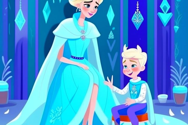 персонаж для мультфильма снежная королева, снежная королева в ледяном замке, снежная королева сидит на ледяном троне, рядом с ней на снегу сидит мальчик и играет кусочками льда