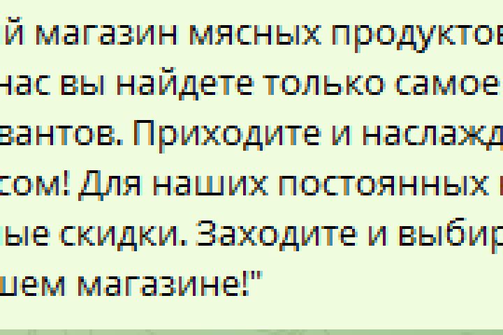 Написать рекламный текст на русском языке длинной не более 400 символов в связи с открытием нового магазина мясных продуктов из зколоически чистого сырья.В магазине действует система скидок для постоянных покупателей.