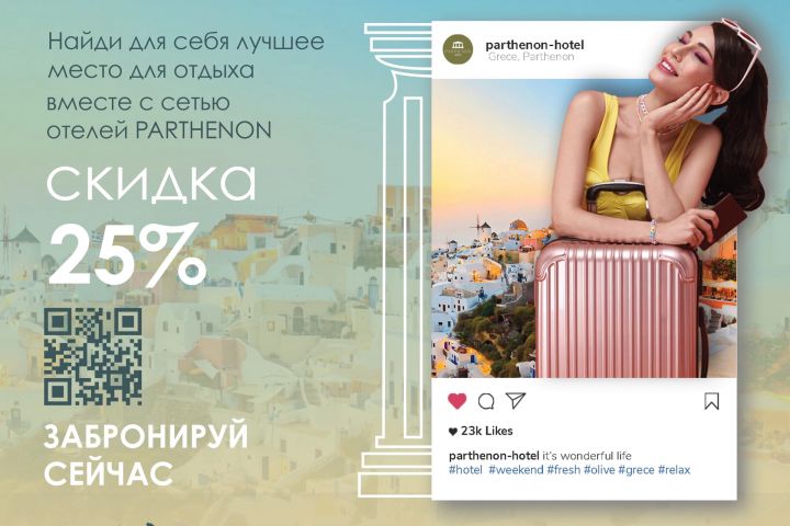 Рекламный плакат для сети отелей содержит основную информацию по акции. Была использована стилеобразующие элементы фирменного стиля компании. Полностью оригинальная задумка в выполнение данной рекламы. Изображение девушки и Греции взяты из стоковых картинок.