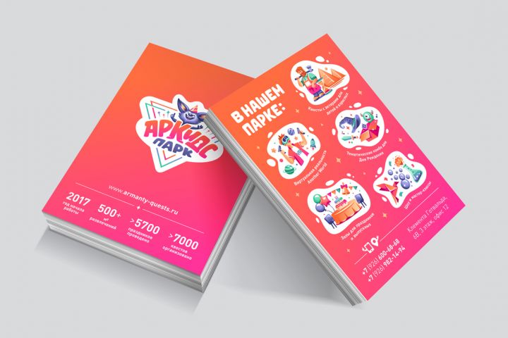 Разработка дизайна информационной листовки для интерактивного парка развлечений. Двусторонняя печать, А5.