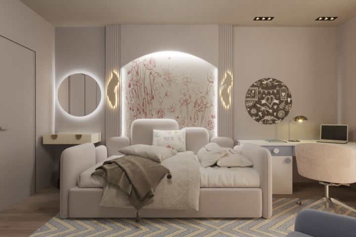 Светлая комната для девочки 12 лет, с небольшой гардеробной, большим рабочим местом, удобной кровати 120см шириной.