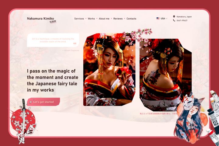 Задачей проекта было создание лендинга для Кимико Накамура — японского фотографа, специализирующегося на традиционном стиле. Главной целью было представить ее работы аудитории в Японии и других азиатских странах, а также англоязычным клиентам.
