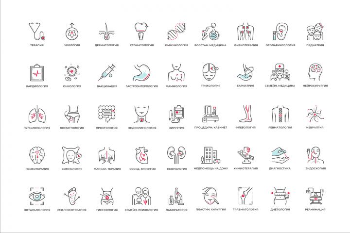Детализированные аутлайновые иконки для многопрофильного медицинского центра, 4 цвета.