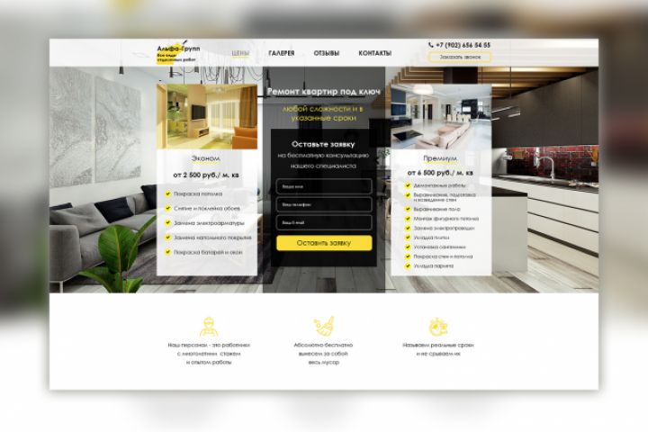Задача стояла разработать дизайн для компании, занимающейся комплексным ремонтом квартир и офисов. Несколько наборов услуг + описание как работает компания, чтобы клиент мог понять и примерно рассчитать стоимость своего ремонта. Сроки разработки - 3 дня.