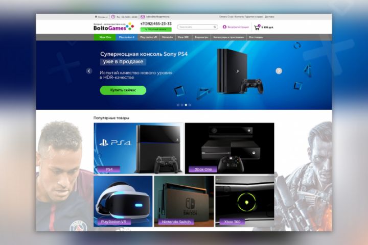 В рамках проекта стояла задача разработать Главную страницу для интернет - магазина по продаже приставок и аксессуаров. Соблюсти заданную цветовую гамму и внести элементы, связанные с игровой тематикой. Срок реализации - 2 рабочих дня.