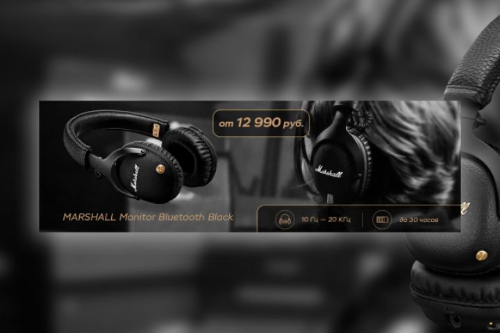 Создание баннера для сайта по продаже аудио товаров в строгом стиле с указанием самой необходимой информации. Срок реализации - в течении 1 рабочего дня.