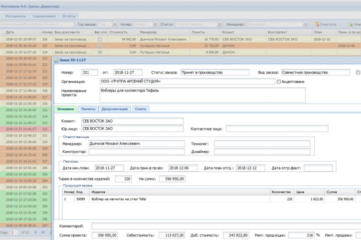 ERP система для компании «Группа Арсений студия» (управление заказами, управление складом, движение материалов, база клиентов, хранилище документов)