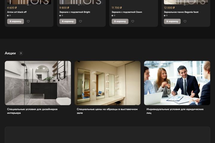 Руководитель компании поставила перед нашими специалистами четкую цель - создать современный интернет-магазин интерьерных зеркал, привлекающий новых клиентов. Проект не совсем стандартный, так как для учета окончательной стоимости, необходимо было добавить в карточку каждого зеркала выбор и расчет размера, типа зеркала и дополнительных опций.