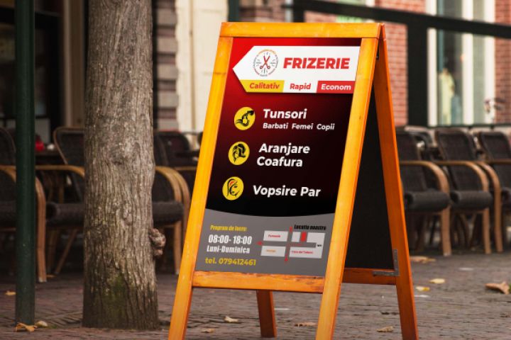 При разработке штендера необходимо было придерживаться фирменных цветов парикмахерской - черный, красный и желтый. Обязательным условием было указать план месторасположения салона.