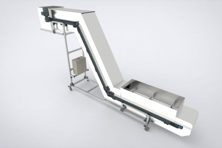 Конвейер Z образный с модульной лентой для транспортировки не насыпного груза. Размер ленты 600 мм. высота ребра 150 мм