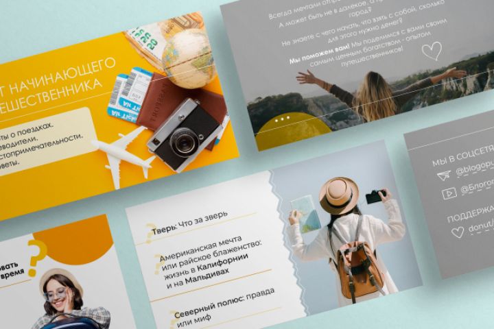 Дизайн презентации для проекта о путешествиях. Разработка дизайн-концепции, верстка материала.