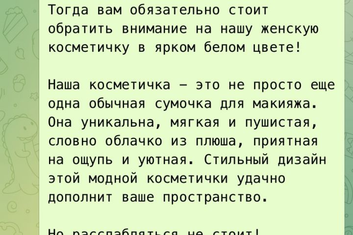 Работы портфолио, выполненные с использованием нейросетей . Описание Информационное. Продающее описание с ключевыми запросами к товару : КОСМЕТИЧКА : (1371 символ)