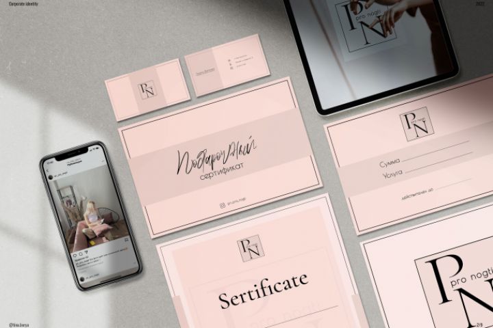 Получилось создать лаконичный дизайн, в котором перекликаются мягкие пастельные цвета и четкие, уверенные формы и линии.Что в совокупности олицетворяет заказчицу и образует единый фирменный стиль