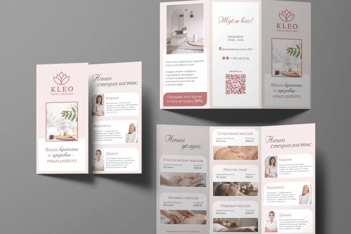 Выполнен дизайн визитки и буклета для салона массажа. Подобрана цветовая палитра, фотографии, шрифты.