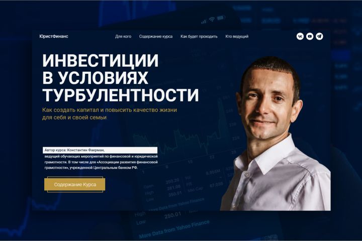 Творческий проект. Главный экран одностраничного сайта для продажи курса по инвестициям.