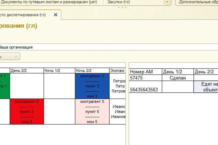 Слева отображаются заявки, справа результат. В заявках можно щёлкнуть на пустую или заполненную данными ячейку, и внести результат по кнопке с контекстного меню. Есть ещё кнопка "установить статус" Где можно установить только статус в регистре. Если статус не "В Рейсе", а в Ремонте, например, то после установки статуса, ячейка становится белого цвета и отображается только статус.