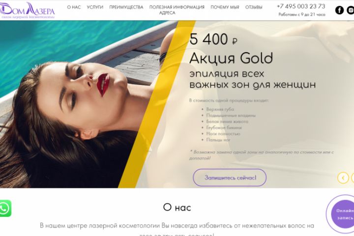 Разработка сайта для салона лазерной косметологии "Дом Лазера". Интерактивные элементы, слайдер, галерея, формы обратной связи.