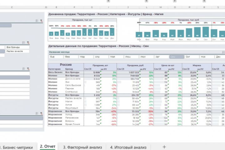 Общий анализ продаж. При изменении данных в фильтрах (срезах) автоматически изменяются данные в таблице, графиках, меняется название таблицы.
