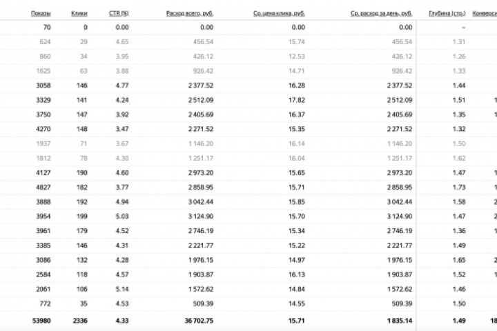 Собрано ключей: 1000 шт Средняя цена за клик (Поиск): 15,71 руб CTR: 4,33% Конверсия: 7,96% Стоимость заявки: 197,33 руб