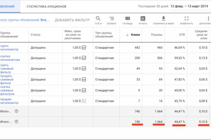 Кампания: Поисковая Кол-во ключей: до 100 CTR: 44,47% Средняя цена за клик: 0,1 $ Цена заявки: 0,83 $